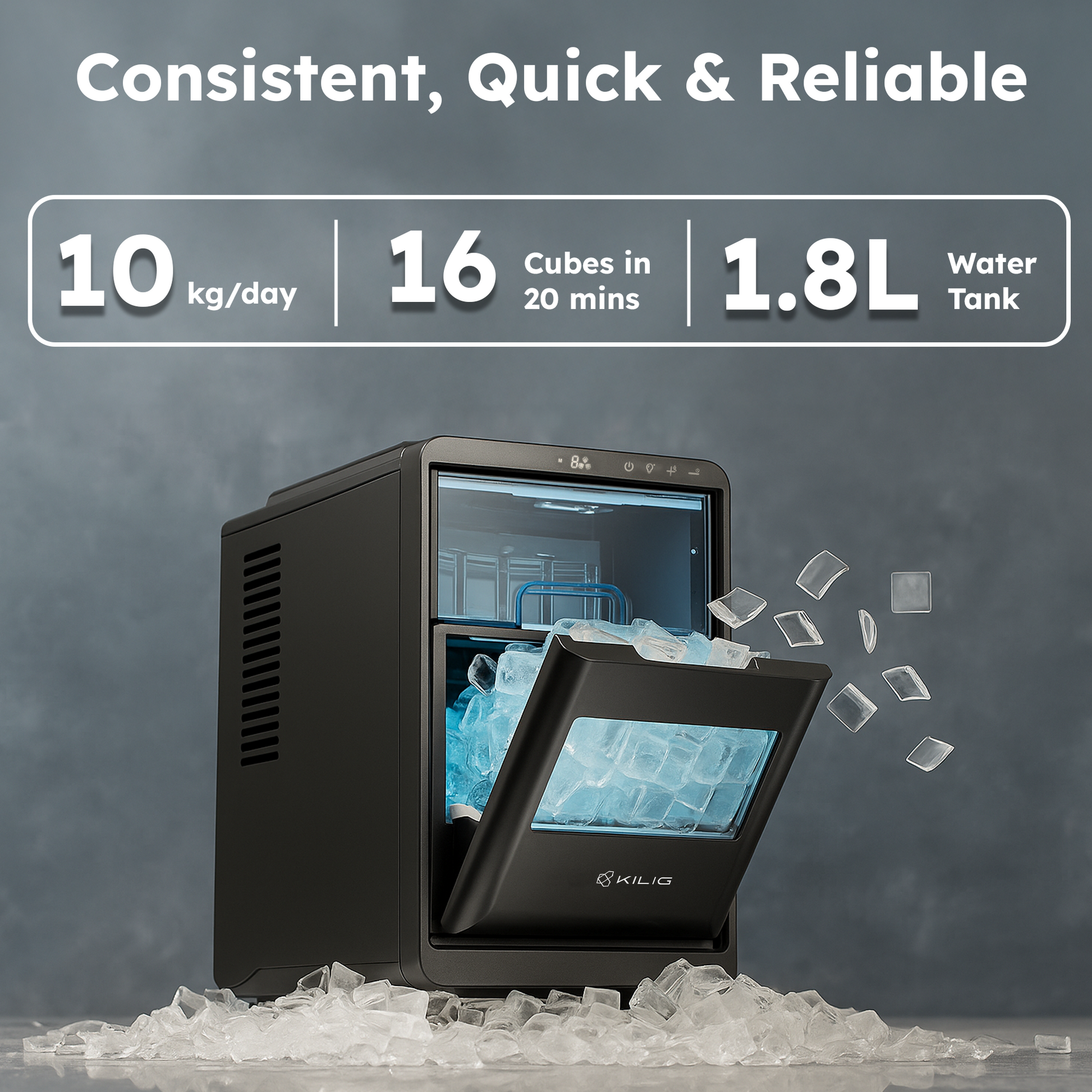 Fast & Steady Ice Production: Produces up to 10 kg of premium-quality ice in 24 hours — perfect for daily use at home, in offices, or small cafés.