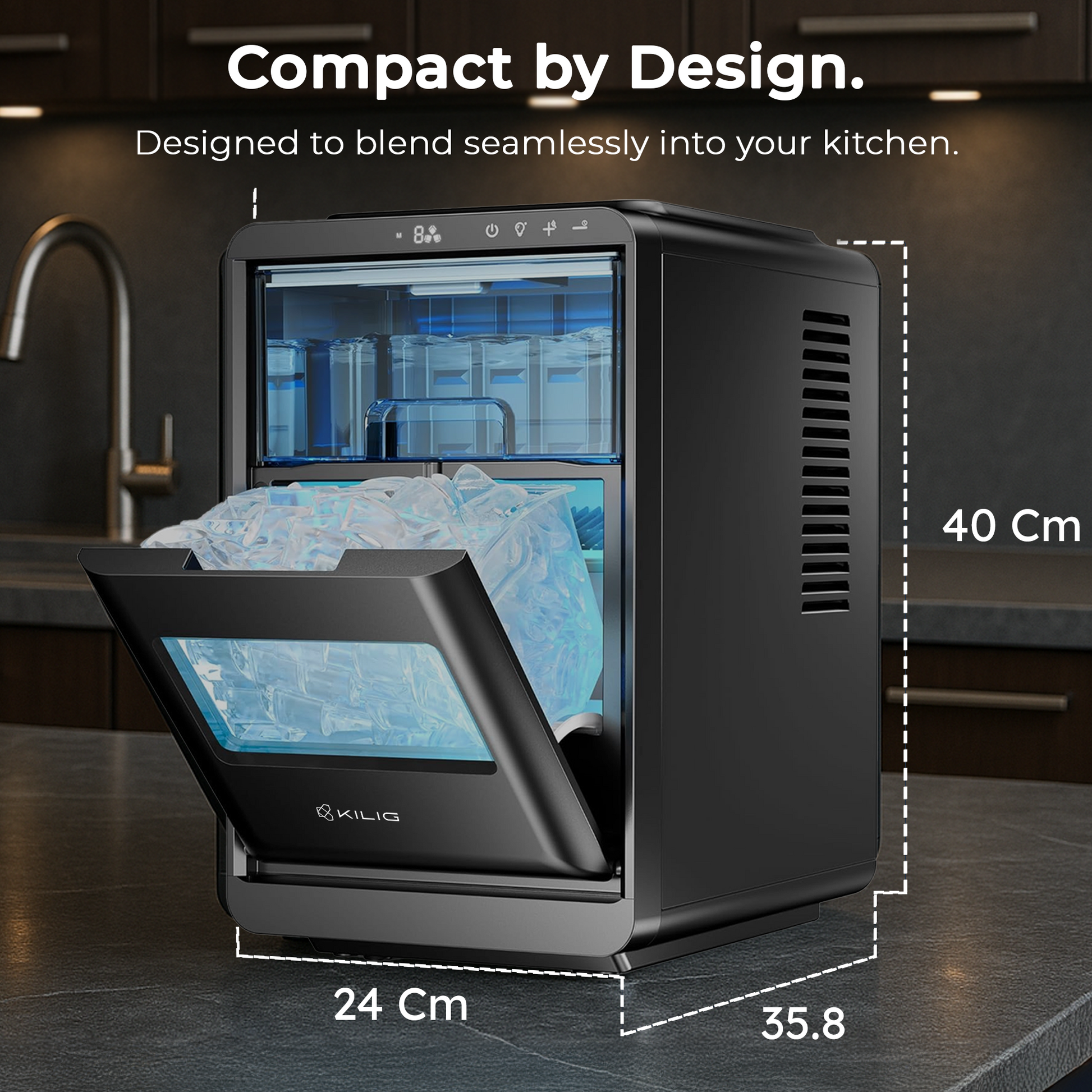 Bring the experience of a premium bar into your home with the Kilig A-01 Countertop Crescent Ice Maker. Designed for Indian homes, offices, and parties, this compact and elegant machine produces 16 clear, slow-melting crescent-shaped ice cubes in just 12–15 minutes, up to 10 kg per day.
