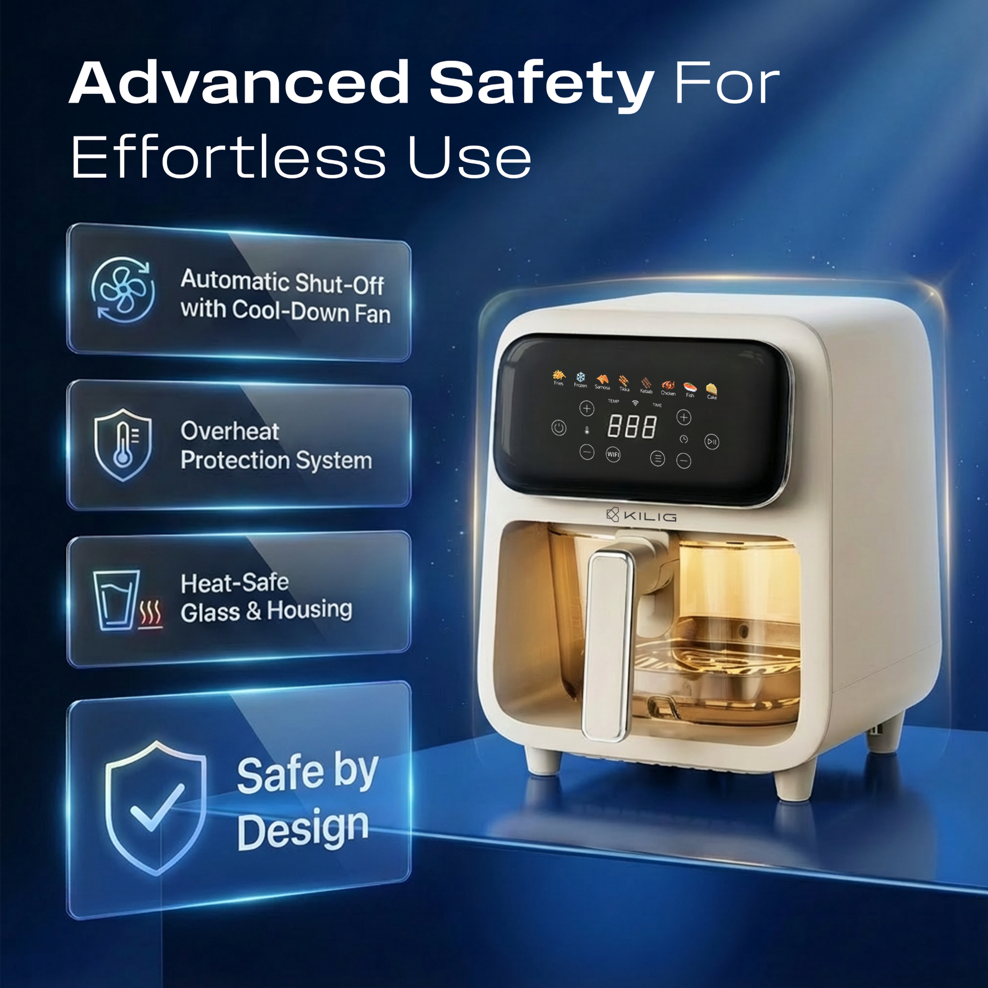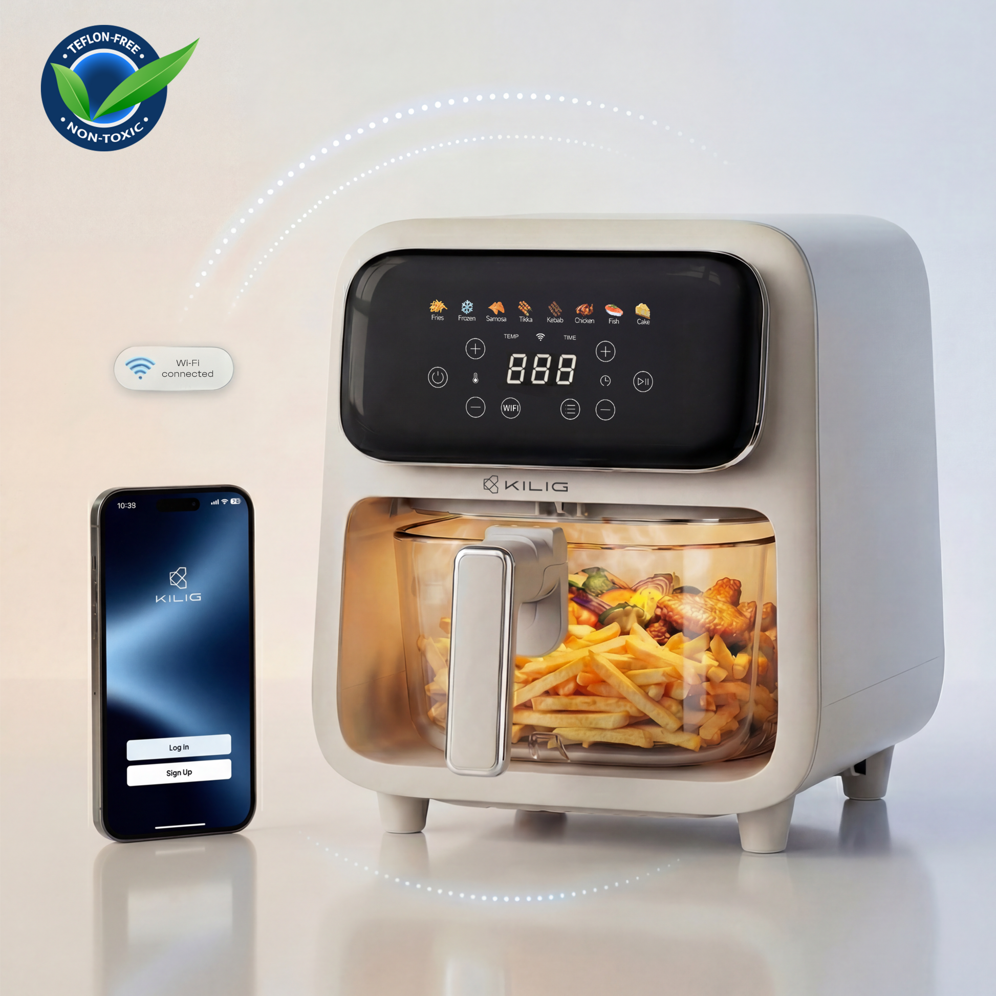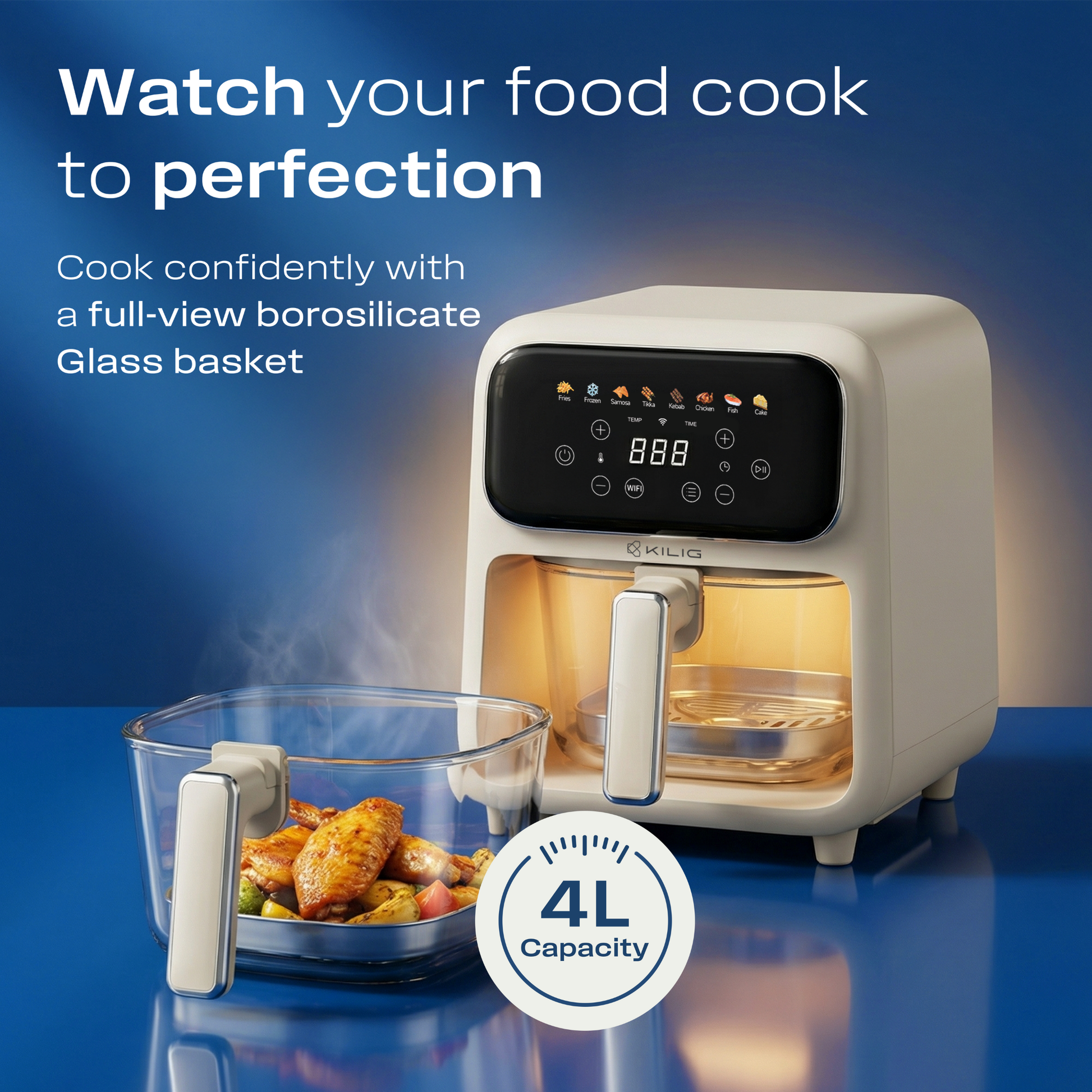 Elevate everyday cooking with the Kilig Nexa Core Air Fryer. Featuring a Teflon-free borosilicate glass basket for safe, real-time viewing and a 4L capacity ideal for daily meals. It delivers fast, even results with powerful 1800W top & bottom heating. Enjoy effortless cooking with 8 Indian & global presets, a sleek touchscreen, DIY memory mode, Wi-Fi app control, and StepChef™ technology that automatically manages each cooking stage. Finished in an elegant beige matte with advanced safety protection for refined, worry-free cooking.