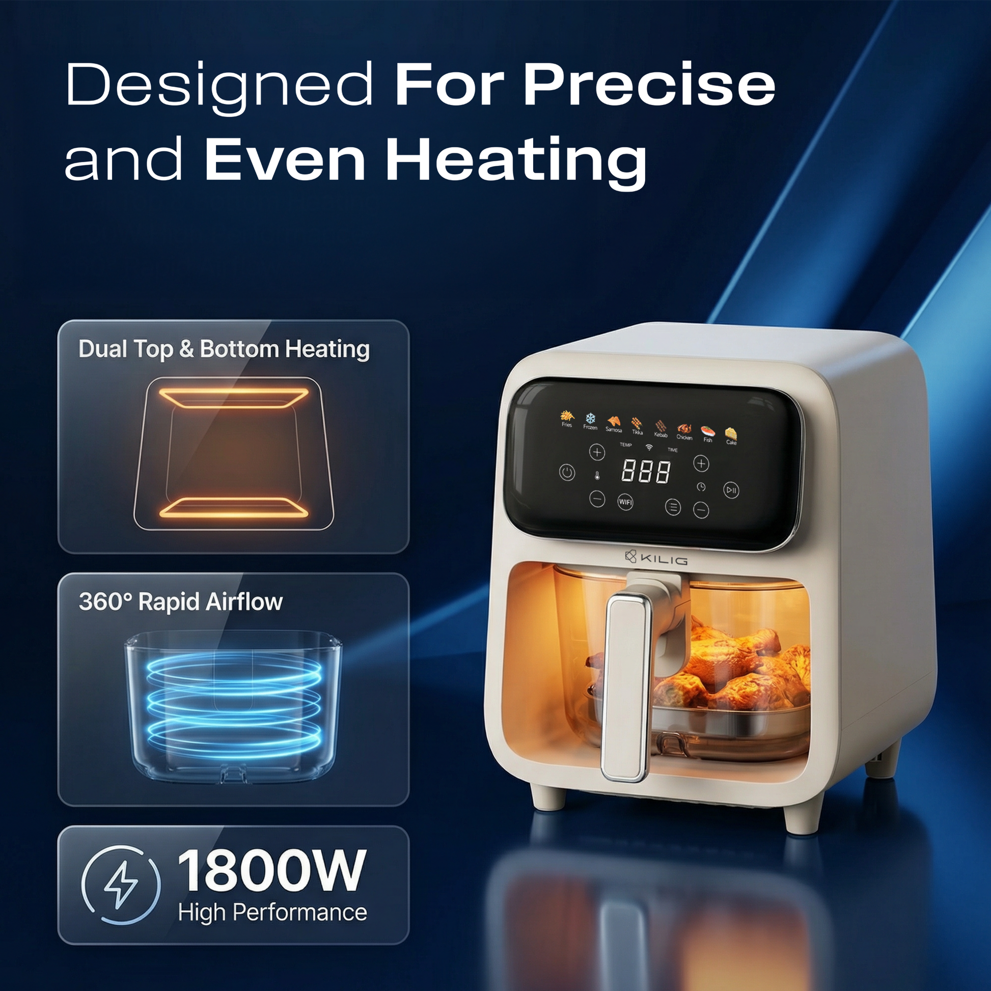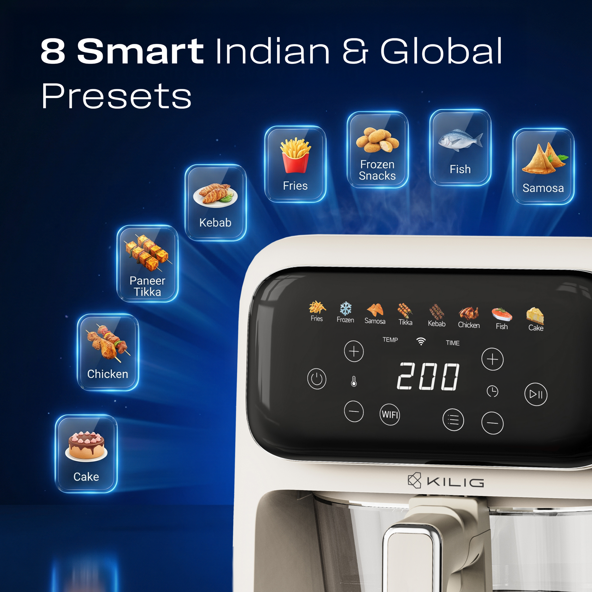 8 One-Touch Indian & Global Presets: Fries, Frozen Snacks, Samosa, Paneer Tikka, Kebab, Chicken, Fish, Cake for consistent results.