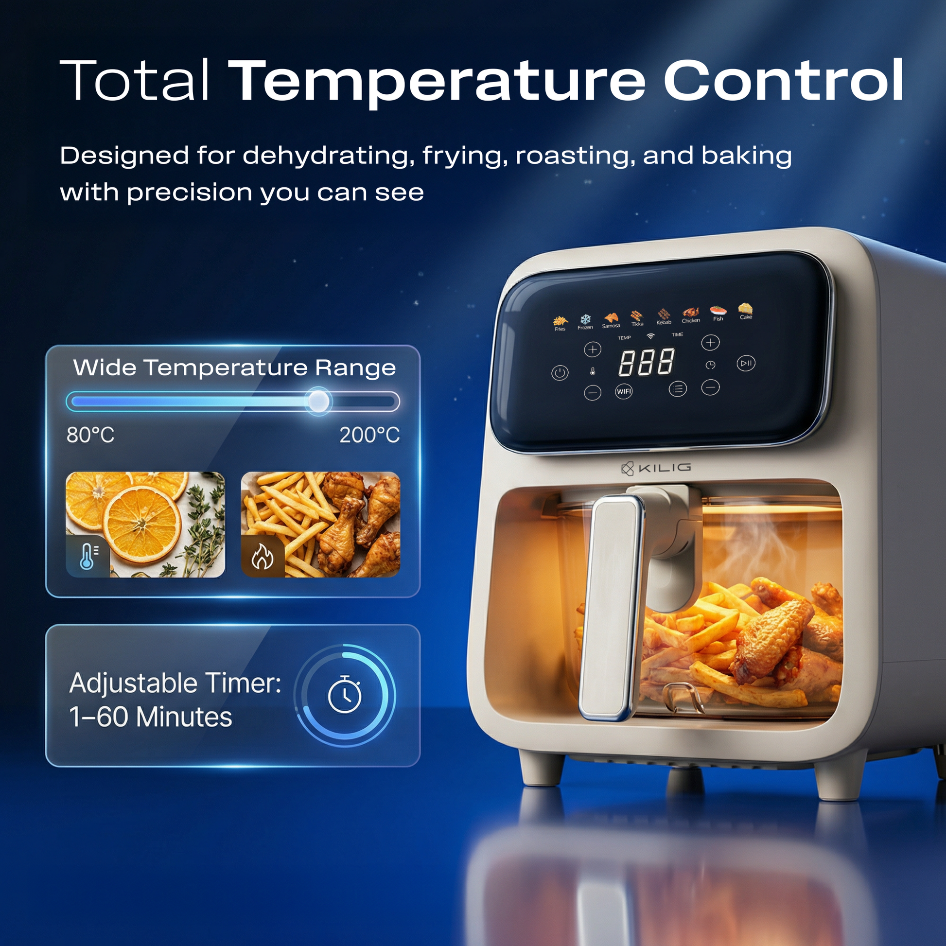 Wi-Fi Enabled Smart Touch Control: Remotely monitor and control cooking via Wi-Fi, with an intuitive touchscreen LED panel for easy start/pause, time, temperature, and preset selection through a sleek digital interface.