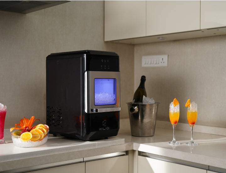 Kilig S01 Countertop Ice Maker makes crystal clear, square ice cubes that up the glam factor of drinks exponentially. Perfect for premium drinks and cocktails. Make continuous ice at the rate of 24 ice cubes every 12-20 minutes, or up to 20 kg ice per day.